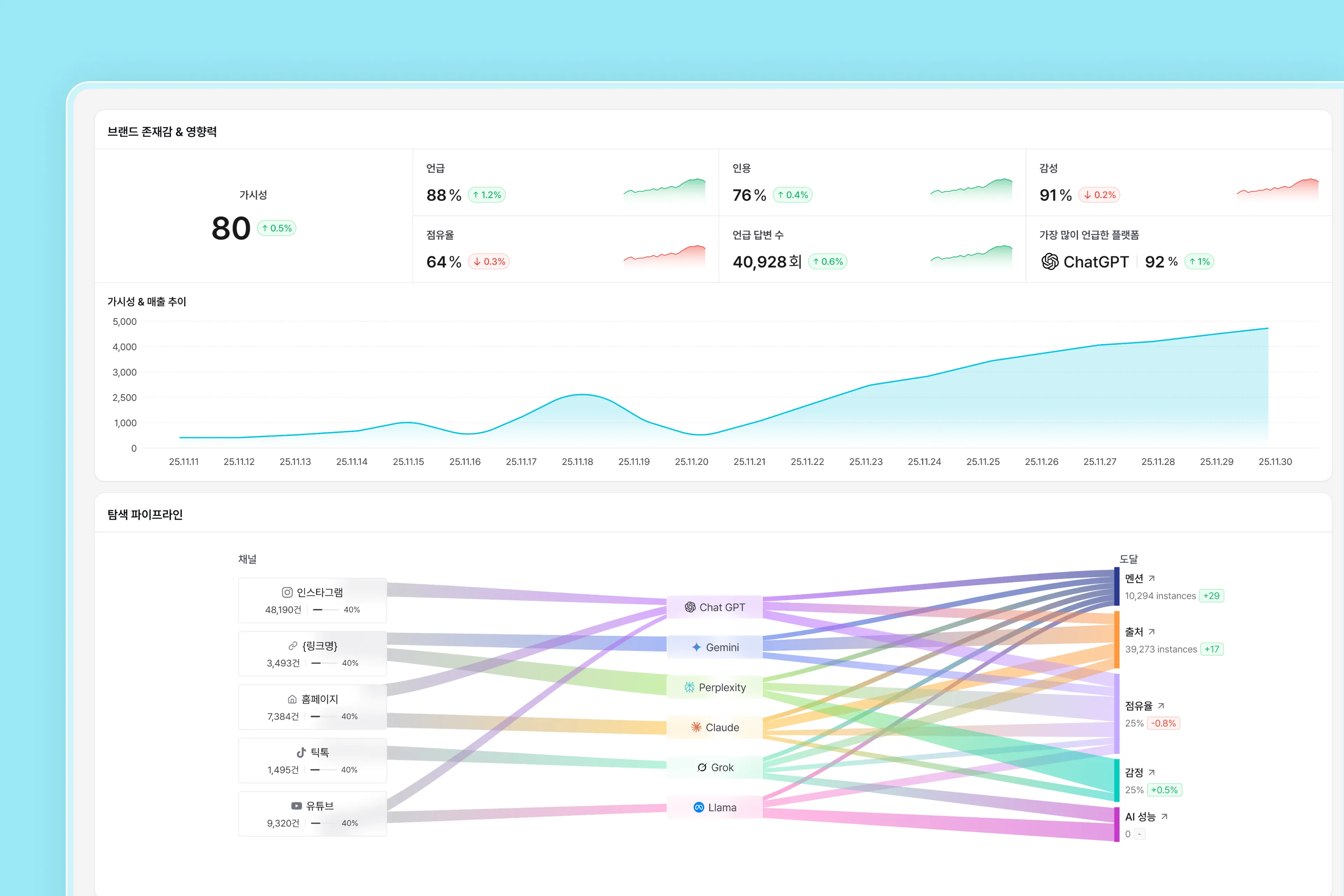 주요 AI 플랫폼에서 브랜드의 노출, 언급, 추천 현황을 한눈에 시각화